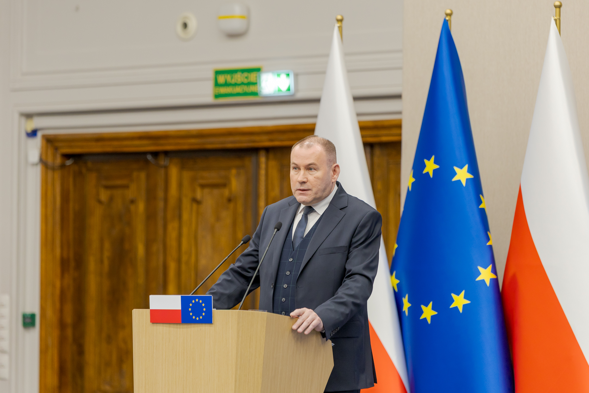 Zbigniew Stawicki zastępca szefa KAS przy mównicy z flagami Polski i Unii Europejskiej wygłasza przemówienie