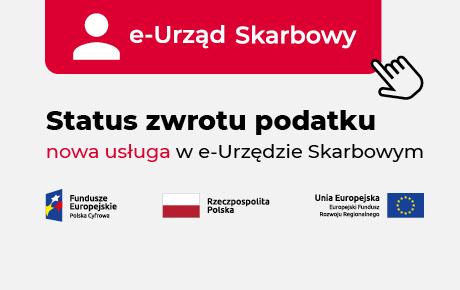 Grafika z logo e-Urzędu Skarbowego, logotypami Funduszy Europejskich, flagami Rzeczypospolitej Polskiej i Unii Europejskiej i napisem Status zwrotu podatku, nowa usługa w e-Urzędzie Skarbowym.