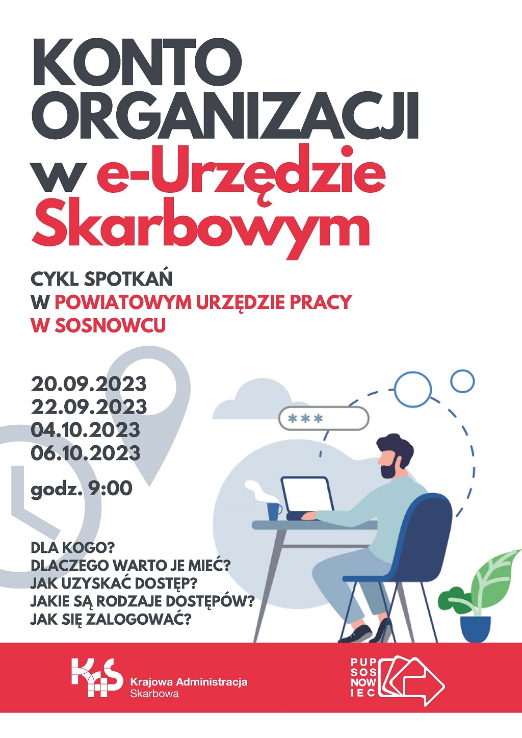 zapraszamy na cykl spotkań informacyjnych dotyczący konta organizacji w e-Urzędzie Skarbowym. Spotkania odbywać się będą przy współpracy z Powiatowym Urzędem Pracy w Sosnowcu. Szczegóły na plakacie.