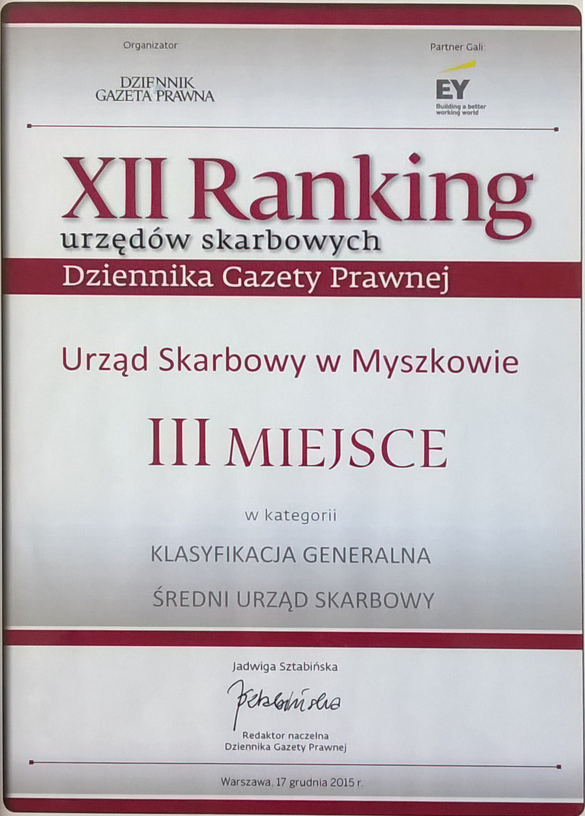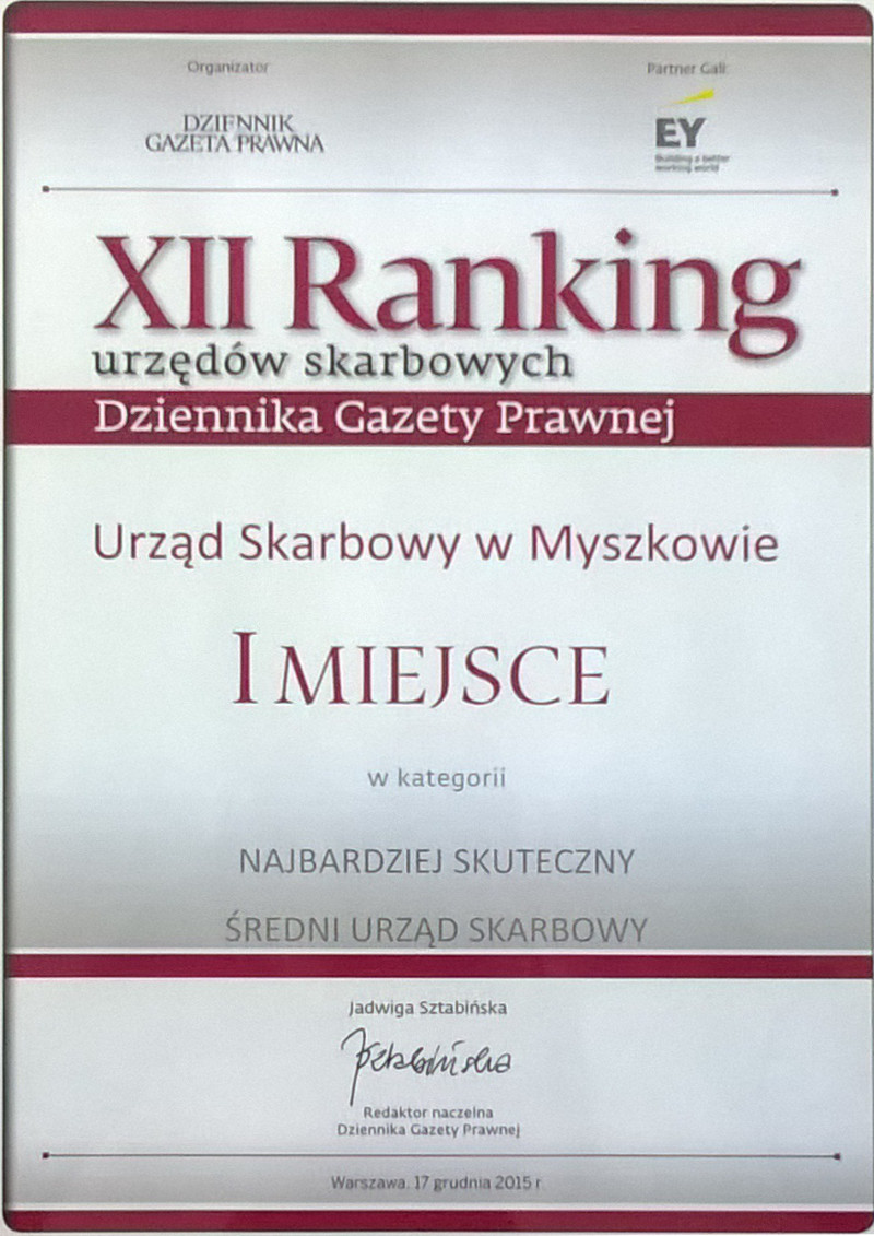 I miejsce w kategorii "Najbardziej Skuteczny - Średni Urząd Skarbowy"